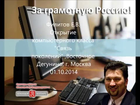 01.10.2014 Открытие компьютерных курсов "Связь Поколений" в Восточном Дегунино. Филитов Е.В.01.04.2014 Связь поколений. Вручение дипломов об окончании 2013-2014 уч. г.30.04.2013 Отзыв Смирновой Г.Н. о программе Связь Поколений. Ломоносовский район, г. Москвы.30.04.2012 г. Отзыв Дроздова ВН -председателя Совета ветеранов Ломоносовского района г. Москвы01.10.2012. Открытие курсов компьютерной грамотности по программе "Связь Поколений" Филитов Е.В.